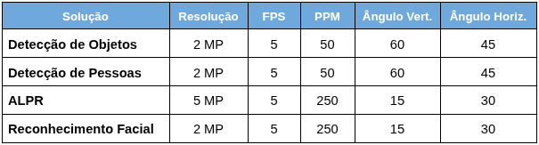Para detecção de objetos, maquinário (como empilhadeiras) e pessoas os ângulos máximos de incidência vertical e horizontal são de 60 e 45 graus, respectivamente. Já para ALPR e reconhecimento facial, os ângulos são 15 graus (vertical) e 30 graus (horizontal).